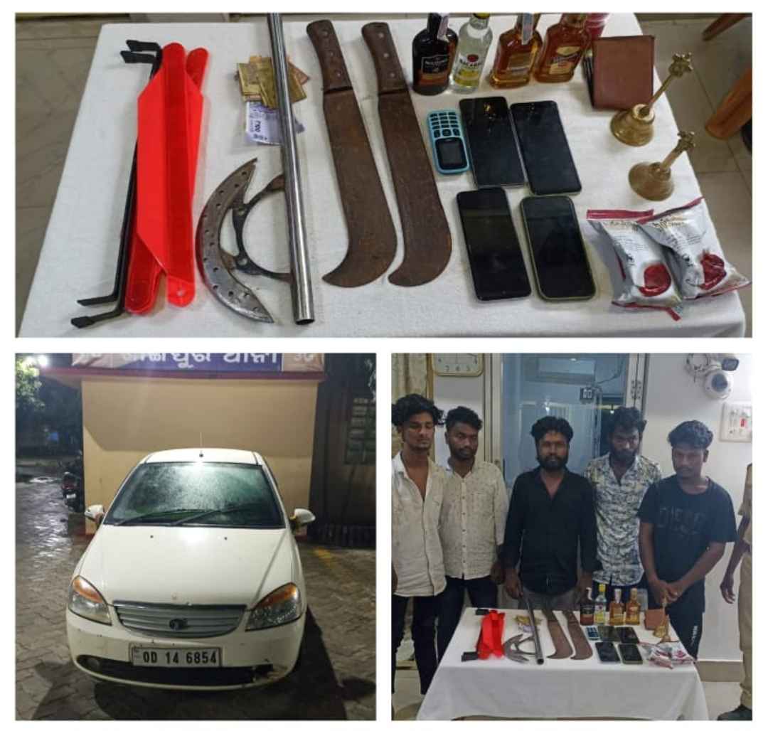 ଡ଼କାୟତି ଯୋଜନା ବେଳେ ପୋଲିସର ଅତର୍କିତ ଚଢ଼ାଉ,ଇଣ୍ଡିଗୋ କାର୍ ଏବଂ ମାରଣାସ୍ତ୍ର ସହିତ ପାଞ୍ଚ ଜଣ ଗିରଫ।