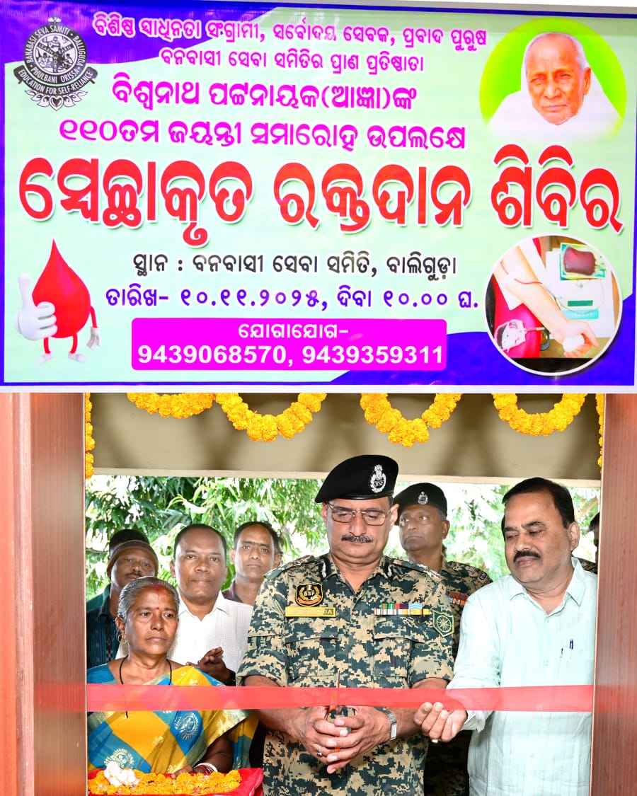 ବିଶିଷ୍ଟ ସ୍ବାଧୀନତା ସଂଗ୍ରାମୀ ଓ ସର୍ବୋଦୟ ଆନ୍ଦୋଳନର ପ୍ରବାଦ ପୁରୁଷ ତଥା ବନବାସୀ ସେବା ସମିତିର ପ୍ରାଣ ପ୍ରତିଷ୍ଠାତା ସ୍ବର୍ଗତ ବିଶ୍ବନାଥ ପଟ୍ଟନାୟକ (ଆଜ୍ଞା)ଙ୍କ ୧୧୦ ତମ ଜୟନ୍ତୀ ଉତ୍ସବ ପାଳନ ଅବସରରେ ସମିତି ଆନୁକୂଲ୍ୟରେ ଏକ ରକ୍ତଦାନ ଶିବିର ସୋମବାର ଅନୁଷ୍ଠିତ ହୋଇଯାଇଛି l ଏଥିରେ ମୁଖ୍ୟ ଅତିଥି ଭାବେ ସ୍ଥାନୀୟ ୧୩୬ ବିଏସଏଫ ର କାମାଣ୍ଡେଣ୍ଡ ମାନସ ରଞ୍ଜନ ପଣ୍ଡା ଓ ସମ୍ମାନିତ ଅତିଥି ଭାବେ ଡେପୁଟି କାମାଣ୍ଡେଣ୍ଡ କମଳ ଲୋଚନ ଦାସ ଯୋଗ ଦେଇ ବିଶ୍ଵନାଥ ଆଜ୍ଞା ଙ୍କ ପ୍ରତିମୂର୍ତ୍ତି ରେ ପୁଷ୍ପ ମାଲ୍ୟାର୍ପଣ ପୂର୍ବକ ଦୀପ ଧୂପ ପ୍ରଜ୍ଜଳନ କରି ଶିବିର ଟିକୁ ଆନୁଷ୍ଠାନିକ ଭାବେ ଉଦଘାଟନ କରିଥିଲେ l ଏଥିରେ ସମିତି ର ସହ ସମ୍ପାଦକ ରବିନ୍ଦ୍ର କୁମାର ପଣ୍ଡା ପରିଚାଳନା କରିଥିବା ବେଳେ ସମ୍ପାଦକ ଉତ୍ସବ ଚନ୍ଦ୍ର ଜେନା ଉପସ୍ଥିତ ରହି ଉତ୍ସାହ ପ୍ରଦାନ କରିଥିଲେ l ଏହି ରକ୍ତଦାନ ଶିବିର ରେ ସମିତି ର ବିଭିନ୍ନ ଶାଖାର କର୍ମୀ ଓ ୧୬ ଜଣ ବିଏସଏଫ ମାନେ ଯୋଗ ଦେଇ ମୋଟ ୪୧ ୟୁନିଟ ରକ୍ତ ସଂଗୃହିତ ହୋଇଥିଲା l ଏଥିରେ ବାଲିଗୁଡା ଉପଖଣ୍ଡ ଚିକିତ୍ସାଳୟ ର ଡ଼ଃ. ଏସ. ରାମ ପାତ୍ର ଓ ତାଙ୍କ ସହଯୋଗୀ ଙ୍କ ନେତୃତ୍ୱ ରେ ସମିତି ର ସମସ୍ତ କର୍ମକର୍ତ୍ତା ଉପସ୍ଥିତ ରହି ପରିଚାଳନା ରେ ସହଯୋଗ କରିଥିଲେ l
