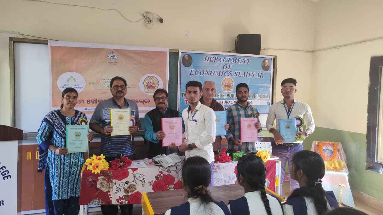 ପୁରୁଷୋତ୍ତମପୁର ତାରାତାରିଣୀ କଲେଜର ଅର୍ଥନୀତି ବିଭାଗ ରେ କୃଷି ବିପଣନ ଉପରେ ଏକ ସେମିନାର ଆୟୋଜନ ହୋଇ ଥିଲା । ଅଧ୍ୟାପକ ଶ୍ରୀ ପ୍ରସାଦ କୁମାର ବେହେରାଙ୍କ ମାର୍ଗଦର୍ଶନରେ +3 ଶେଷ ବର୍ଷର ଛାତ୍ର ଶ୍ରୀ ଦିନେଶ ବେହେରା ଏହି ନିବନ୍ଧ ଉପସ୍ଥାପନ କରିଥିଲେ। କାର୍ଯ୍ୟକ୍ରମଟି ଅର୍ଥନୀତି ବିଭାଗର ମୁଖ୍ୟ ଡକ୍ଟର ଶ୍ରୀରାମ ମିଶ୍ରଙ୍କ ତତ୍ତ୍ବାବଧାନରେ ହୋଇଥିଲା, ଉକ୍ତ କାର୍ଯ୍ୟକ୍ରମ କୁ ସୁଶ୍ରୀ ମିନାକ୍ଷୀ ଦାସ ଦକ୍ଷତାର ସହିତ ଶୃଙ୍ଖଳା ବଜାୟ ରଖି ଥିଲେ। ସେମିନାରକୁ ଅଧ୍ଯକ୍ଷ ଡକ୍ଟର ପ୍ରଦୀପ କୁମାର ସାହୁ ଉଦଘାଟନ କରିଥିଲେ, ଯିଏ ଶିକ୍ଷାଗତ ଉତ୍କର୍ଷତା ହାସଲ କରିବାରେ ନିୟମିତ ଶ୍ରେଣୀଗୃହ ଶିକ୍ଷାର ଗୁରୁତ୍ବ ଏବଂ ଲାଭ ଉପରେ ଗୁରୁତ୍ବାରୋପ କରିଥିଲେ। ସମ୍ବଳ ସାଧନ ବ୍ୟକ୍ତି ଶ୍ରୀ ସୁଦର୍ଶନ ପଣ୍ଡା ଏକ ସଂକ୍ଷିପ୍ତ କିନ୍ତୁ ଅନ୍ତ ଦୃଷ୍ଟିପୂର୍ଣ୍ଣ ଆଲୋଚନା କରିଥିଲେ। ଶିକ୍ଷକ ଏବଂ ଛାତ୍ରଛାତ୍ରୀମାନଙ୍କୁ ନେଇ ଏକ ପାରସ୍ପରିକ ଗୋଷ୍ଠୀ ଆଲୋଚନା ସହିତ କାର୍ଯ୍ୟକ୍ରମ ଶେଷ ହୋଇଥିଲା। ଏହି କାର୍ଯ୍ୟକ୍ରମ ରେ କଲେଜର ସମସ୍ତ ଅଧ୍ୟାପକ ଓ ଅଧ୍ୟାପିକା ଯୋଗ ଦେଇଥିଲେ ||ପାଠଚକ୍ର ସମ୍ପାଦକ ଶ୍ରୀ ଗଙ୍ଗା ପାତ୍ର ଧନ୍ୟବାଦ ଅର୍ପଣ କରିଥିଲେ |