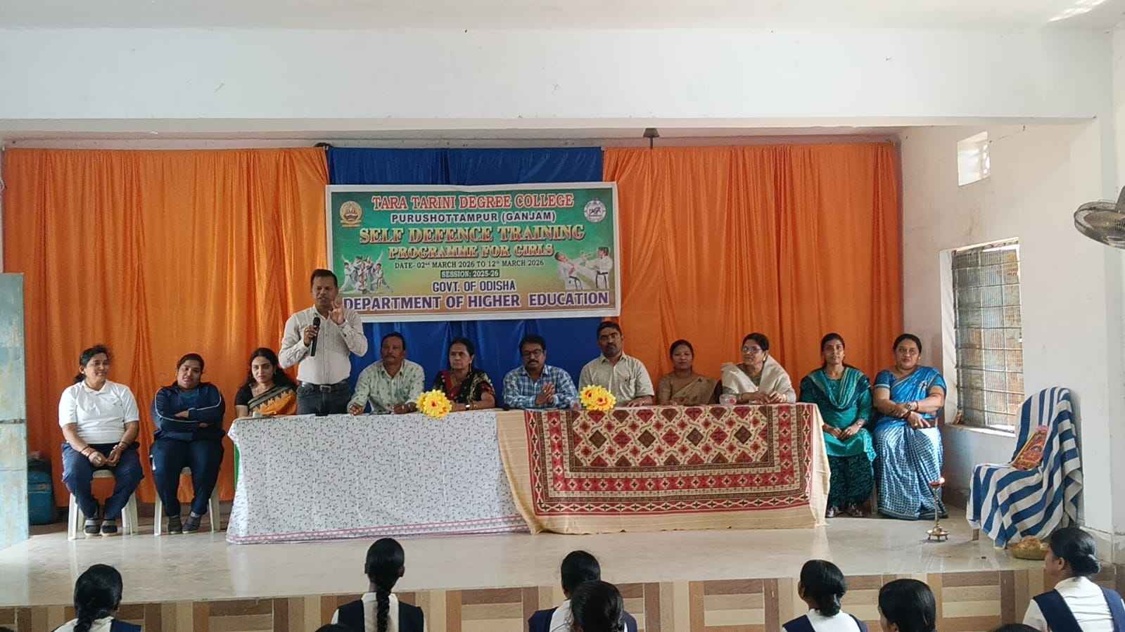 ମହାବିଦ୍ୟାଳୟରେ ଛାତ୍ରୀମାନଙ୍କ ସଶକ୍ତିକରଣ ଓ ସୁରକ୍ଷାକୁ ଲକ୍ଷ୍ୟ କରି ଆତ୍ମରକ୍ଷା ତାଲିମ ଶିବିର ଆୟୋଜିତ ହୋଇଯାଇଛି। ଏହି ଶିବିର ଆତ୍ମସୁରକ୍ଷା ସଂଯୋଜିକା ଡଃ ଶ୍ରାବଣୀ ଖଟାଇଙ୍କ ପ୍ରତ୍ୟକ୍ଷ ତତ୍ତ୍ୱାବଧାନରେ ଅନୁଷ୍ଠିତ ହୋଇଥିଲା।ମୁଖ୍ୟ ଅତିଥି ଭାବେ ମହାବିଦ୍ୟାଳୟର ଅଧ୍ୟକ୍ଷ ଡ଼ଃ ପ୍ରଦୀପ କୁମାର ସାହୁ ଯୋଗଦେଇ ଶିବିରକୁ ଉଦ୍ଘାଟନ କରିବା ସହ ସଭାପତିତ୍ୱ କରିଥିଲେ। ସେ ତାଙ୍କ ଉଦ୍ବୋଧନରେ କହିଥିଲେ ଯେ, ବର୍ତ୍ତମାନ ସମାଜରେ ଛାତ୍ରୀମାନଙ୍କ ପାଇଁ ଆତ୍ମରକ୍ଷା ତାଲିମ ଅତ୍ୟନ୍ତ ଆବଶ୍ୟକ। ଏପରି ଶିବିର ଛାତ୍ରୀମାନଙ୍କ ମଧ୍ୟରେ ସାହସ, ଆତ୍ମବିଶ୍ୱାସ ଓ ସଚେତନତା ବୃଦ୍ଧି କରି ସେମାନଙ୍କୁ ସୁରକ୍ଷିତ ଓ ସଶକ୍ତ କରିବାରେ ସହାୟକ ହେବ।