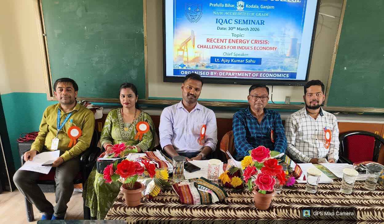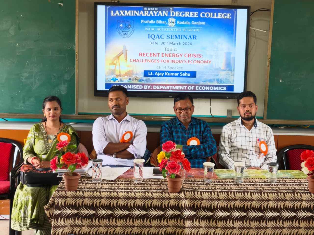 -ସୋମବାର ଦିବା 10 ଘଣ୍ଟ ସମୟରେ କୋଦଳା ସ୍ଥିତ ଲକ୍ଷ୍ମୀନାରାୟଣ ସ୍ନାତକ ମହାବିଦ୍ୟାଳୟରେ ଅଧ୍ୟକ୍ଷ ଶ୍ରୀଯୁକ୍ତ ରଘୁନାଥ ମୁଦୁଲିଙ୍କ ସଭାପତିତ୍ୱରେ ଅର୍ଥନୀତି ବିଭାଗ ତରଫରୁ ସାମ୍ପ୍ରତିକ ଶକ୍ତି ସଙ୍କଟ : ଭାରତୀୟ ଅର୍ଥନୀତି ପାଇଁ ଏକ ଆହ୍ୱାନ "ବିଷୟବସ୍ତୁ କୁ ନେଇ ଅନ୍ତର୍ନିହିତ ଗୁଣାବଳୀ ବର୍ଦ୍ଧକ ପାଠଚକ୍ର ଅନୁଷ୍ଠିତ ହୋଇଯାଇଛି । କାର୍ଯ୍ୟକ୍ରମ ର ପ୍ରାରମ୍ଭରେ ଅନ୍ତର୍ନିହିତ ଗୁଣାବଳୀ ବର୍ଦ୍ଧକ ସଂଯୋଜକ ଶ୍ରୀମାନ ସପନ କୁମାର ଦାଶ ଉପସ୍ଥିତ ଅତିଥିଙ୍କ ପରିଚୟ ପ୍ରଦାନ କରିଥିଲେ lପାଠଚକ୍ର ର ଆଭିମୁଖ୍ୟ ସମ୍ପର୍କେ ଅର୍ଥନୀତି ବିଭାଗର ଅଧ୍ୟାପିକା ତଥା ଆଜିର କାର୍ଯ୍ୟକ୍ରମ ର ଆବାହକ ଶ୍ରୀମତୀ ସୁସ୍ମିତା କୁମାରୀ ମହାପାତ୍ର କହିଥିଲେ l ସାଧନାକର୍ମୀ ଭାବେ ପିପୁଲସ କଲେଜ ବୁଗୁଡ଼ା ର ଅର୍ଥନୀତି ବିଭାଗୀୟ ମୁଖ୍ୟ ଲେଫ୍ଟନାଣ୍ଟ ଅଜୟ କୁମାର ସାହୁ ଯୋଗଦେଇ ସାମ୍ପ୍ରତିକ ଶକ୍ତି ସଙ୍କଟ କିପରି ଭାରତୀୟ ଅର୍ଥନୀତି ପ୍ରତି ଏକ ଆହ୍ୱାନ ହୋଇପଡିଛି ଏବଂ ଏହାର ବିକଳ୍ପ ବିଷୟରେ ପୁଙ୍ଖାନୁପୁଙ୍ଖ ଆଲୋଚନା କରିଥିଲେ l ମହାବିଦ୍ୟାଳୟ ର ଅଧ୍ୟକ୍ଷ ଶ୍ରୀଯୁକ୍ତ ରଘୁନାଥ ମୁଦୁଲି ଭାରତରେ ସାମ୍ପ୍ରତିକ ଶକ୍ତି ସଙ୍କଟ ବିଷୟରେ ନିଜର ମତ ରଖିଥିଲେ l ଅର୍ଥନୀତି ବିଭାଗର ଅଧ୍ୟାପକ ଶ୍ରୀ ଆଲୋକ ଜେନା ଧନ୍ୟବାଦ ଅର୍ପଣ କରିଥିଲେ lପ୍ରାରମ୍ଭିକ ସଂଗୀତ ଯୁକ୍ତ ତିନି ଦ୍ୱିତୀୟ ବର୍ଷ ଛାତ୍ରୀ ସୁଶ୍ରୀ ପଦ୍ମିନୀ ବେହେରା ଓ ପ୍ରିୟଙ୍କା ପାଢୀ ଅନ୍ତିମ ସଂଗୀତ ଯୁକ୍ତ ତିନି ପ୍ରଥମ ବର୍ଷ ଛାତ୍ରୀ ସୁଶ୍ରୀ ଆରତୀ ପ୍ରଧାନ, ଜସ୍ମିନ ମେହେଣା ଓ ଅଙ୍କିତା ସ୍ୱାଇଁ ଗାନ କରିଥିଲେ lଯୁକ୍ତ ତିନି ପ୍ରଥମ, ଦ୍ୱିତୀୟ ଓ ଶେଷ ବର୍ଷ ର ଅନେକ ଛାତ୍ରଛାତ୍ରୀ ସେମାନଙ୍କ ସନ୍ଦର୍ଭ ଉପସ୍ଥାପନା କରିଥିଲେ ଓ ସେମାନଙ୍କୁ ପ୍ରମାଣପତ୍ର ଅତିଥିମାନଙ୍କ ଦ୍ୱାରା ପ୍ରଦାନ କରାଯାଇଥିଲା l