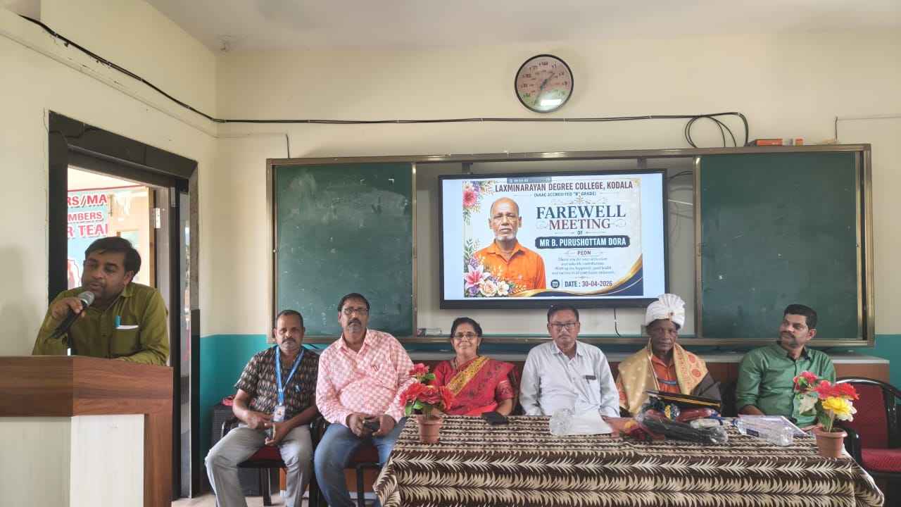 ଗୁରୁବାର ଦିବା ୧୧ ଘଣ୍ଟ ସମୟରେ ଲକ୍ଷ୍ମୀନାରାୟଣ ସ୍ନାତକ ମହାବିଦ୍ୟାଳୟ ରେ ତୃତୀୟ ସହାୟକ ବି. ପୁରୁଷୋତ୍ତମ ଦୋରା ଙ୍କ ଅବସର କାଳୀନ ସଭା ର ଆୟୋଜନ କରାଯାଇଥିଲା ୲ ଏଥିରେ ମହାବିଦ୍ୟାଳୟ ର ଅଧ୍ୟକ୍ଷ ଶ୍ରୀ ରଘୁନାଥ ମୁଦୁଲି ଅଧ୍ୟକ୍ଷତା କରିଥିଲେ ୲ ଅଧ୍ୟାପକ ବିନୋଦ କୁମାର ମିଶ୍ର,ସାଗର ଚନ୍ଦ୍ର ପାତ୍ର,ପ୍ରଦୀପ କୁମାର ପଣ୍ଡା,ସପନ କୁମାର ଦାଶ, ଲିପୁନ୍ କୁମାର ମାଝୀ ଅଧ୍ୟାପିକା ରଂଜୁବାଳା ନନ୍ଦ,ଗୃହଲକ୍ଷ୍ମୀ ସାହୁ, ତପସ୍ଵିନୀ କରଣ, ପ୍ରିୟଦର୍ଶିନୀ ସାହୁ , ମଣି ଚରଣ ଶତପଥୀ ପ୍ରମୁଖ ଶ୍ରୀ ଯୁକ୍ତ ପୁରୁଷୋତ୍ତମ ଦୋରା ଙ୍କ ସହ ବିତାଇଥିବା ମୁହୂର୍ତ୍ତ ଗୁଡିକ ର ସ୍ମୃତି ଚାରଣ କରିଥିଲେ ୲ ଅଧ୍ୟକ୍ଷ ଙ୍କ ଦ୍ଵାରା ମାନପତ୍ର ପ୍ରଦାନ ସହ ଅବସର କାଳୀନ ଉପହାର ପ୍ରଦାନ କରାଯାଇଥିଲା ୲ଅଧ୍ୟାପକ ସପନ କୁମାର ଦାଶ ନିଜ ଅନୁଭୂତି କୁ ନେଇ ଏକ ସ୍ଵ ରଚିତ କବିତା ପାଠ କରି ଉପସ୍ଥିତ ସମସ୍ତ କର୍ମଚାରୀ ଙ୍କୁ ଧନ୍ୟବାଦ ଅର୍ପଣ କରିଥିଲେ ୲ ସମସ୍ତ କର୍ମଚାରୀ ଙ୍କ ସହଯୋଗରେ ଅବସର କାଳୀନ ସଭା ସଫଳ ରୂପାୟନ ହୋଇପାରିଥିଲା ୲