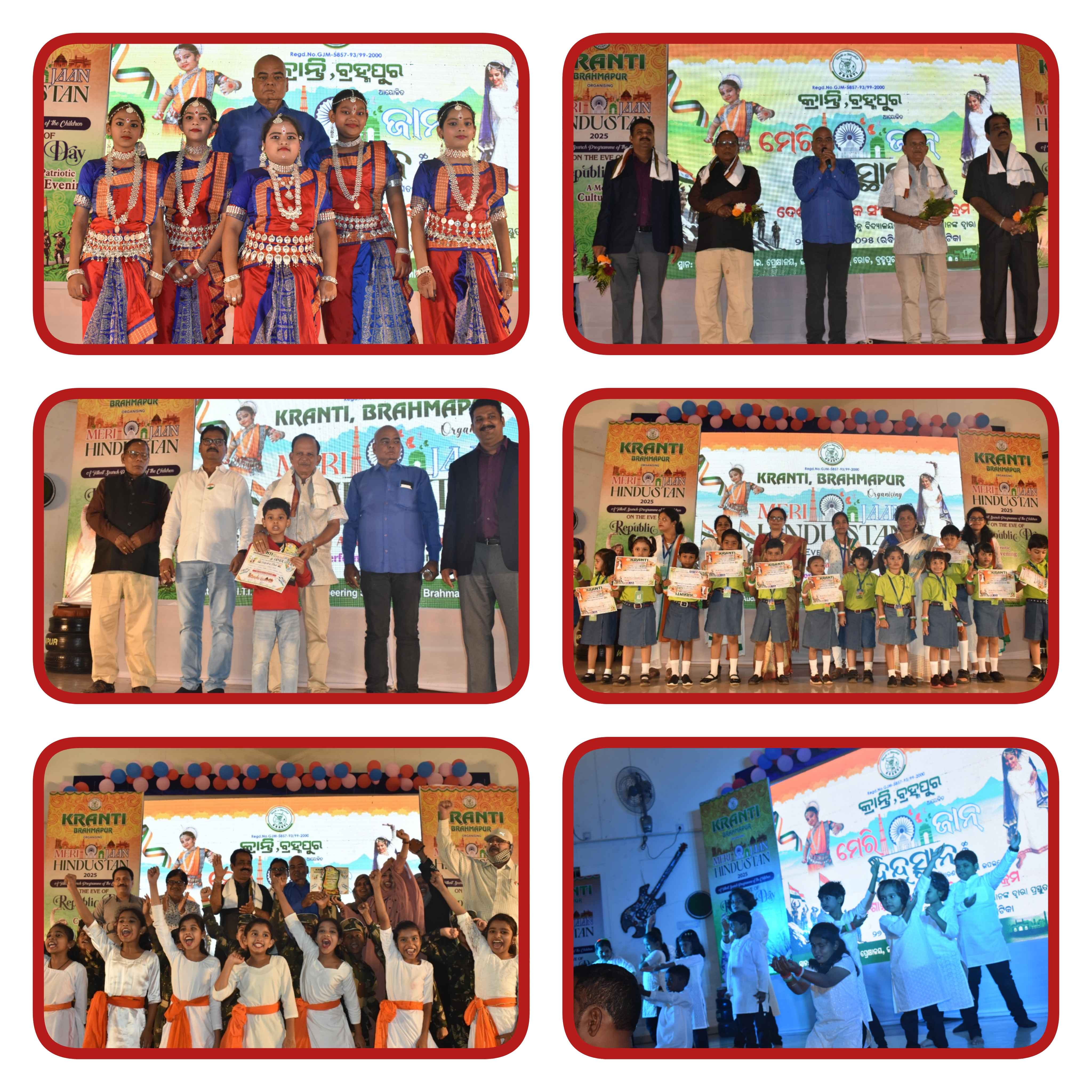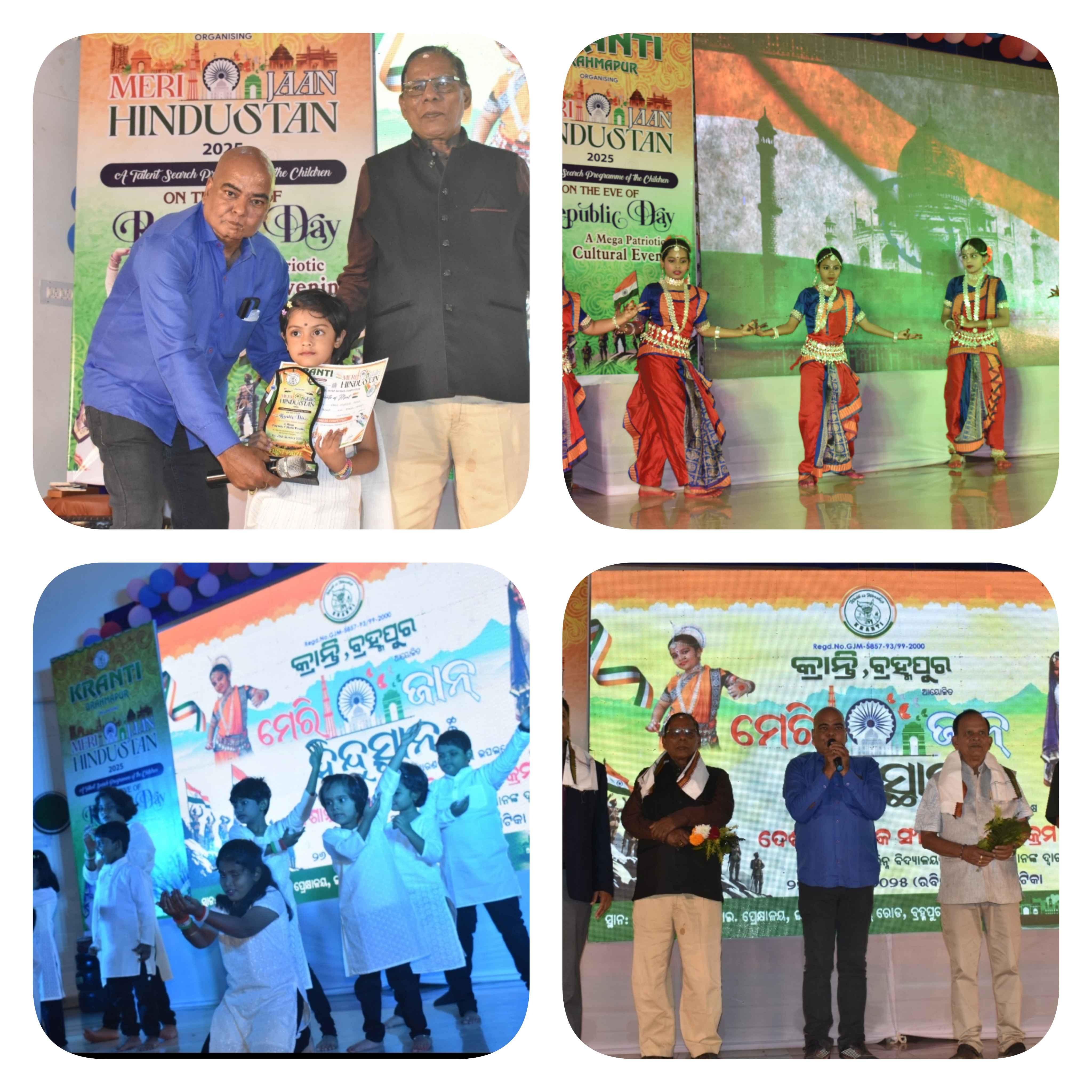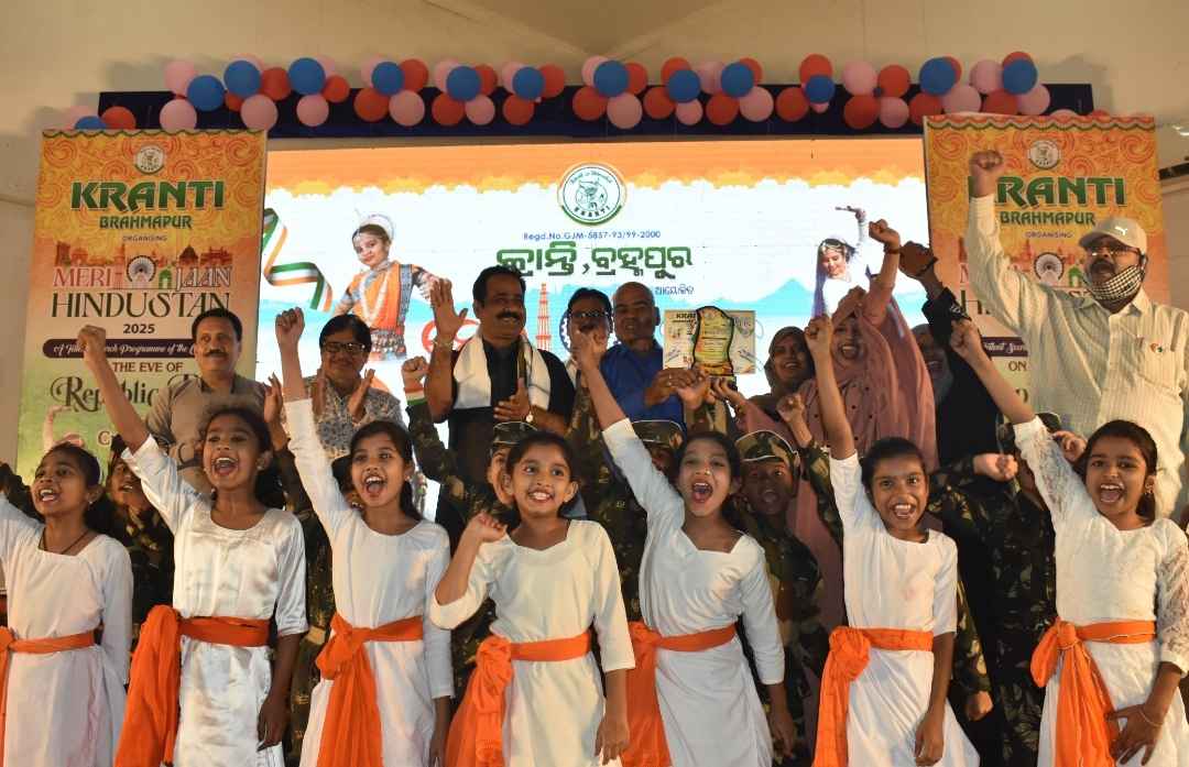 ବ୍ରହ୍ମପୁର ତା ୨୭.୦୧.୨୦୨୫ ରିଖ :ସ୍ଥାନୀୟ ବ୍ରହ୍ମା ନଗର ୧ମ ସାରଣୀ ସ୍ଥିତ ଅଗ୍ରଣୀ ସାମାଜିକ ଅନୁଷ୍ଠାନ କ୍ରାନ୍ତି ତରଫରୁ ଦେଶାତ୍ମବୋଧକ ସାଂସ୍କୃତିକ କାର୍ଯ୍ୟକ୍ରମ `ମେରୀ ଜାନ୍ ହିନ୍ଦୁସ୍ତାନ -୨୦୨୫"` ସ୍ଥାନୀୟ ସରକାରୀ ଶିଳ୍ପ ତାଲିମ ପ୍ରତିଷ୍ଠାନ ପ୍ରେକ୍ଷାଳୟ ଠାରେ ମହାସମାରୋହରେ ପାଳିତ ହୋଇ ଯାଇଛି। ସମସ୍ତ ଅତିଥି ମାନେ ପ୍ରଥମେ ଜଗତର ନାଥ ପ୍ରଭୁ ଶ୍ରୀ ଜଗନ୍ନାଥଙ୍କୁ ପୁଷ୍ପମାଲ୍ୟ ଅର୍ପଣ କରିବା ସହ ପ୍ରଦୀପ ପ୍ରଜ୍ବଳନ କରି କାର୍ଯ୍ୟକ୍ରମକୁ ଶୁଭାରମ୍ଭ କରିଥିଲେ।
