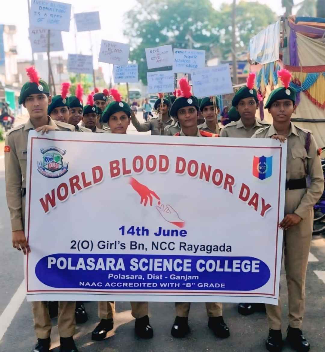 ବିଜ୍ଞାନ ମହାବିଦ୍ୟାଳୟର ଏନ୍.ସି.ସି. କ୍ୟାଡେଟ ମାନଙ୍କ ଦ୍ଵାରା 2(O) ଗାର୍ଲ୍ସ୍ ବଟାଲିୟନ ରାୟଗଡ଼ା ତରଫରୁ ବିଶ୍ଵ ରକ୍ତଦାନ ଦିବସରେ ଏକ ବିରାଟ ରାଲିର ଆୟୋଜନ କରାଯାଇଛି । ଏହି ରାଲିରେ ପୋଲସରା ବିଜ୍ଞାନ ମହାବିଦ୍ୟାଳୟର ପ୍ରିନ୍ସିପାଲ୍ ପ୍ରଫେସର ରବୀନ୍ଦ୍ରନାଥ ପାଳ ଉଦଘାଟନ କରି ଏନ୍.ସି.ସି. କ୍ୟାଡେଟ ମାନଙ୍କୁ ଉତ୍ସାହିତ କରାଇଥିଲେ । ଏନ୍.ସି.ସି. ଲେଫ୍ଟନାଣ୍ଟ ବିନତା କୁମାରୀ ଦାସ୍ ଛାତ୍ରୀମାନଙ୍କ ସହିତ ଏହି ରାଲିରେ ଯୋଗ ଦେଇ ବ୍ଲକଠାରୁ ଏନ.ଏ.ସି କାର୍ଯ୍ୟାଳୟ ପର୍ଯ୍ୟନ୍ତ ବିଶ୍ଵ ରକ୍ତଦାନ ଦିବସ ରେ ସ୍ଲୋଗାନ ଦେଇ କ୍ୟାଡେଟ୍ ଏବଂ ଜନସାଧାରଣ ମାନଙ୍କୁ ସଚେତନ କରାଇଥିଲେ ।