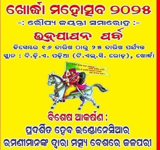 ଖୋର୍ଦ୍ଧା ରେ ବିଗତ ବର୍ଷମାନଙ୍କ ପରି ଚଳିତ ବର୍ଷ ଐତିହାସିକ ଖୋର୍ଦ୍ଧା ମହୋତ୍ସବ ଆଜି ଠାରୁ ଅର୍ଥାତ ଡ଼ିସେମ୍ବର ୧୬ ରୁ ୨୫ ତାରିଖ ପର୍ଯ୍ୟନ୍ତ ସ୍ଥାନୀୟ ଟି.ଏଲ.ସି ରୋଡ଼ର ବି.ଡ଼ି.ଏ ପଡ଼ିଆଠାରେ ଅନୁଷ୍ଠିତ ହେବ । ଖୋର୍ଦ୍ଧା ହେଉଛି ଭାରତର ଶେଷ ସ୍ୱାଧୀନ ଦୁର୍ଗ I ଏହି ଐତିହାସିକ ପୃଷ୍ଠଭୂମିରୁ ଆରମ୍ଭ ହୋଇଥିଲା ଭାରତ ସ୍ଵାଧୀନତା ଆନ୍ଦୋଳନର ପ୍ରଥମ ମୁକ୍ତି ସଂଗ୍ରାମ ପାଇକ ବିଦ୍ରୋହ । ତେଣୁ ଖୋର୍ଦ୍ଧାର ମହାନ୍ ଐତିହାସିକ ପୃଷ୍ଠଭୂମିକୁ ଆଧାର କରି ୨୦୦୦ ମସିହାରେ ସ୍ଥାନୀୟ ସ୍ୱେଚ୍ଛାସେବୀ ସଂଗଠନ “ ନିୟୁ ଥିକିଙ୍ଗ୍ ଫୋରମ୍” ଦ୍ଵାରା ଆରମ୍ଭ କରାଯାଇଥିଲା, ଖୋର୍ଦ୍ଧା ମହୋତ୍ସବ । ଏହାର ମୁଖ୍ୟ ଉଦ୍ଦେଶ୍ୟ ଥିଲା ଖୋର୍ଦ୍ଧାର ମହାନ୍ ଐତିହ୍ୟ, ସଂସ୍କୃତି ଓ ପରମ୍ପରାକୁ ଉଜ୍ଜୀବିତ କରିବା ସଙ୍ଗେ ସଙ୍ଗେ ଏହାକୁ ବିଶ୍ଵ ଦରବାରରେ ପରିଚିତ କରାଇବା l, ୨୦୦୦ ମସିହାରୁ ଆରମ୍ଭ କରାଯାଇଥୁବା ଏହି ମହୋତ୍ସବର ୨୫ବର୍ଷ ପୂର୍ତ୍ତି ୨୦୨୪ ରେ ପାଳନ କରାଯାଇଥିଲା । ଚଳିତ ବର୍ଷ ଏହି ପୂର୍ତ୍ତି ଉତ୍ସବର ଉଦ୍ଯାପନ ପର୍ବକୁ ବହୁ ଆଡ଼ମ୍ବର ସହ ପାଳନ କରାଯିବ ବୋଲି ସ୍ଥାନୀୟ ବିଧାୟକ ସ୍ଵତନ୍ତ୍ର ଭାବେ ଦାୟୀତ୍ଵ ନେଇଛନ୍ତି । ଏଥିରେ ୩୦୦ରୁ ଅଧୂକ ପ୍ରଦର୍ଶନୀ ମଣ୍ଡପ, ପିଲାମାନଙ୍କର ମନୋରଞ୍ଜନ ପାଇଁ ବିଭିନ୍ନ ପ୍ରକାର ଦୋଳି ଇତ୍ୟାଦି ସ୍ଥାନ ପାଇବା ସଙ୍ଗେ ସଙ୍ଗେ ପ୍ରତିଦିନ ସଂଧ୍ୟାରେ ରାଜ୍ୟ ଓ ରାଜ୍ୟ ବାହାରୁ ବହୁ କଳାକାର ଅନୁଷ୍ଠାନମାନେ ଅଂଶ ଗ୍ରହଣ କରିବେ ଏବଂ ଷ୍ଟାର୍ ନାଇଟ୍ କାର୍ଯ୍ୟକ୍ରମ ଅନୁଷ୍ଠିତ ହେବ । ଚଳିତ ବର୍ଷ ମନୋରଞ୍ଜନର ମୁଖ୍ୟ ଆକର୍ଷଣ ହେବ ଜଳପରୀ । ଏଥିରେ ଇଣ୍ଡୋନେସିଆର ଝିଅମାନେ ଜଳପରୀ ଭାବେ ଉଭା ହେବେ ।