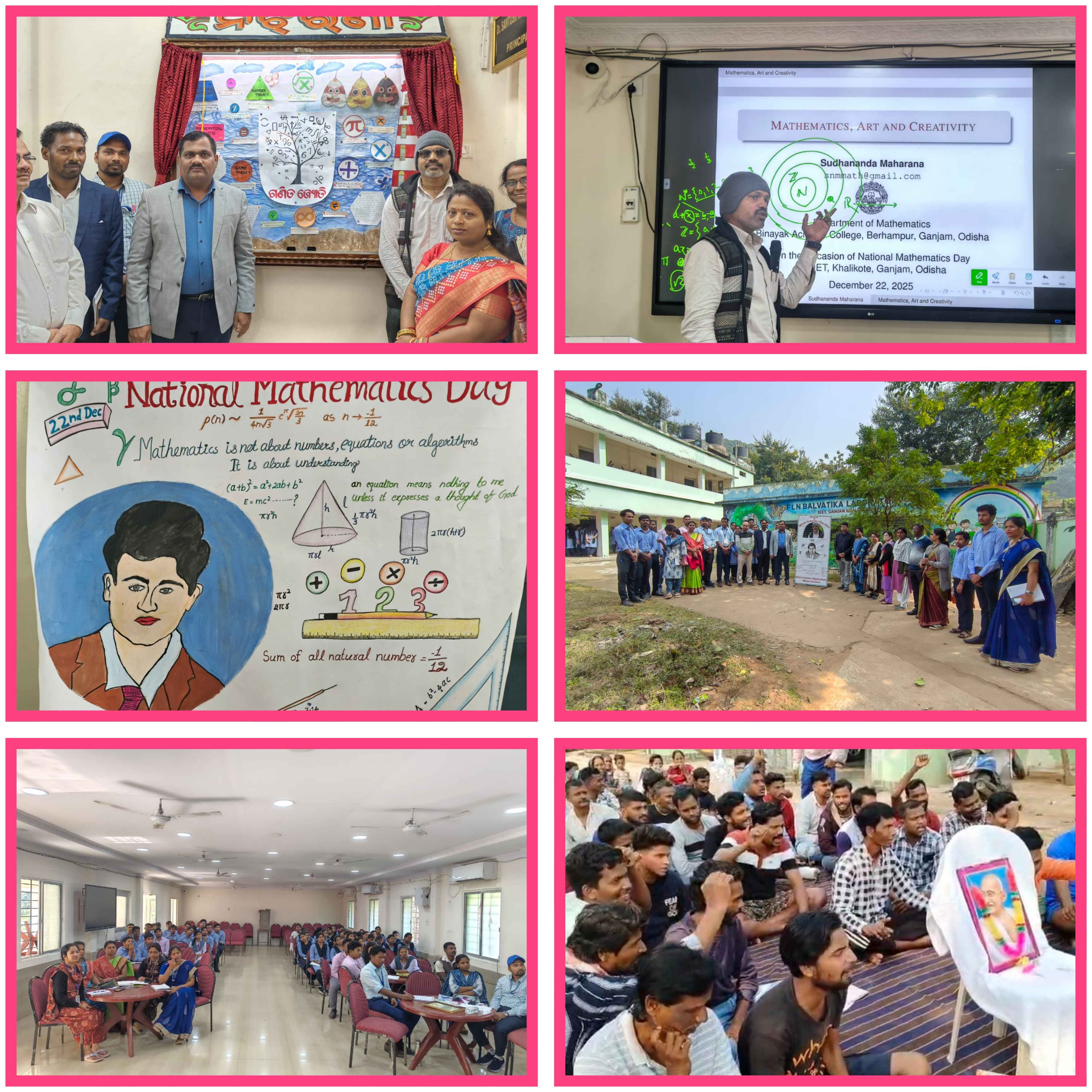 ଜିଲ୍ଲା ଶିକ୍ଷା ଓ ପ୍ରଶିକ୍ଷଣ ପ୍ରତିଷ୍ଠାନ, ଗଞ୍ଜାମ, ଖଲ୍ଲିକୋଟ ଆନୁକୁଲ୍ୟରେ ଅନୁଷ୍ଠାନର ଅଧ୍ୟକ୍ଷ ଡ. ସନ୍ତୋଷ କୁମାର ପରିଡ଼ାଙ୍କ ଅଧ୍ୟକ୍ଷତାରେ ଜାତୀୟ ଗଣିତ ଦିବସ ୨୨ ଡିସେମ୍ବର ୨୦୨୫ ରେ ଆନୁଷ୍ଠାନିକ ରୀତିରେ ପାଳିତ ହୋଇଯାଇଛି। ଉକ୍ତ କାର୍ଯ୍ୟକର୍ମରେ ମୁଖ୍ୟ ଅତିଥି ରୂପେ ଡ. ସୁଧାନନ୍ଦ ମହାରଣା, ଆସିଷ୍ଟାଣ୍ଟ ପ୍ରଫେସର, ବିନାୟକ ଆଚାର୍ଯ୍ୟ ଡିଗ୍ରୀ ମହାବିଦ୍ୟାଳୟ, ବ୍ରହ୍ମପୁର , ଗଞ୍ଜାମ ଯୋଗ ଦେଇ ନିଜ ଅଭିଭାଷଣରେ ଜାତୀୟ ଗଣିତ ଦିବସର ଉପାଦେୟତା ଏବଂ ମହାନ୍ ଗଣିତଜ୍ଞ ଶ୍ରୀନିବାସ ରାମାନୁଜଙ୍କ ଗଣିତ କ୍ଷେତ୍ରରେ ଥିବା ଅବଦାନ ଏବଂ ତାଙ୍କ ଗଣିତର ଅବଦାନ ଆଜିର ଏହି ଏକବିଂଶ ଶତାବ୍ଦୀରେ ଦୈନନ୍ଦିନ ଜୀବନରେ ଗଣିତର ଆବଶ୍ୟକତା ସମ୍ପର୍କରେ ଗଭୀର ଭାବେ ଆଲୋକପାତ କରିଥିଲେ । ଏହି କାର୍ଯ୍ୟକର୍ମକୁ ଅନୁଷ୍ଠାନର ଶିକ୍ଷକ ପ୍ରଶିକ୍ଷକ ମୁକ୍ତିକାନ୍ତ ବେହେରା ସଂଯୋଜନା କରିଥିବା ବେଳେ ଶିକ୍ଷକ ପ୍ରଶିକ୍ଷକ ନବୀନ କୁମାର ପ୍ରମାଣିକ ଓ ଜିତେନ୍ଦ୍ର କୁମାର ପଣ୍ଡା ମଞ୍ଚ ପରିଚାଳନା କରୁଥିଲେ। ଉକ୍ତ ଦିବସ ଉପଲକ୍ଷେ ଗଣିତ,ଆର୍ଟ ଓ କ୍ରିଏଟିଭିଟି ପ୍ରସଙ୍ଗକୁ ଆଧାର କରି ଅନୁଷ୍ଠାନର ପ୍ରଥମ ଓ ଦ୍ବିତୀୟ ବର୍ଷ ଗୁରୁ ଛାତ୍ରଛାତ୍ରୀଙ୍କ ମଧ୍ୟରେ ପ୍ରତିଯୋଗିତା ଆୟୋଜନ କରାଯାଇଥିଲା । ଅନୁଷ୍ଠାନର ସମସ୍ତ ଗୁରୁ ଛାତ୍ରଛାତ୍ରୀ ଏଥିରେ ଅଂଗ୍ରହଣ କରି ନିଜ ନିଜର ଉପସ୍ଥାପନ ପ୍ରତିପାଦନ କରିଥିଲେ। ଅନୁଷ୍ଠାନର ବରିଷ୍ଠ ଶିକ୍ଷକ ପ୍ରଶିକ୍ଷକ ବିଷ୍ଣୁ ନାରାୟଣ ଜେନା, ଅଭିରାମ ବିଶ୍ବାଳ, ବରିଷ୍ଠ ଶିକ୍ଷକ ପ୍ରଶିକ୍ଷିକା ନିହାରିକା ସାମନ୍ତରାୟ, ପ୍ରଜ୍ଞା ପାରମିତା, ଶିକ୍ଷକ ପ୍ରଶିକ୍ଷକ ସୁକୁଲେଇ ଟୁଡୁ, ଶିକ୍ଷକ ପ୍ରଶିକ୍ଷିକା ଲିପିଶ୍ରୀ ଦେବୀ, ଜୟନ୍ତୀ ବେହେରା, କଲ୍ୟାଣୀ ଗୌଡ଼, ଭାବିଲିତା ନାୟକ, ଗାୟତ୍ରୀ ସ୍ୱାଇଁ, ଅନୁପମା ଦାସ, ବବିତା ସିଂ ନାୟକ, ସେକ୍ସନ ଅଫିସର ପ୍ରବେଶ କୁମାର ପଟ୍ଟନାୟକ ଓ ଅନ୍ୟ କର୍ମଚାରୀ ଆଶିଷ କୁମାର ସେଠୀ, ନିରୁପମା ପ୍ରଧାନ, ମନୋରଞ୍ଜନ ବାରିକ,ସୁକାନ୍ତି ସେଠୀ, ଜୟ ଶଙ୍କର ଗୌଡ଼, ଚନ୍ଦ୍ର ନାୟକ ପ୍ରମୁଖ ଉପସ୍ଥିତ ଥିଲେ। ସର୍ବ ଶେଷରେ ନବୀନ କୁମାର ପ୍ରମାଣିକ ଧନ୍ୟବାଦ ଅର୍ପଣ କରିଥିଲେ ।