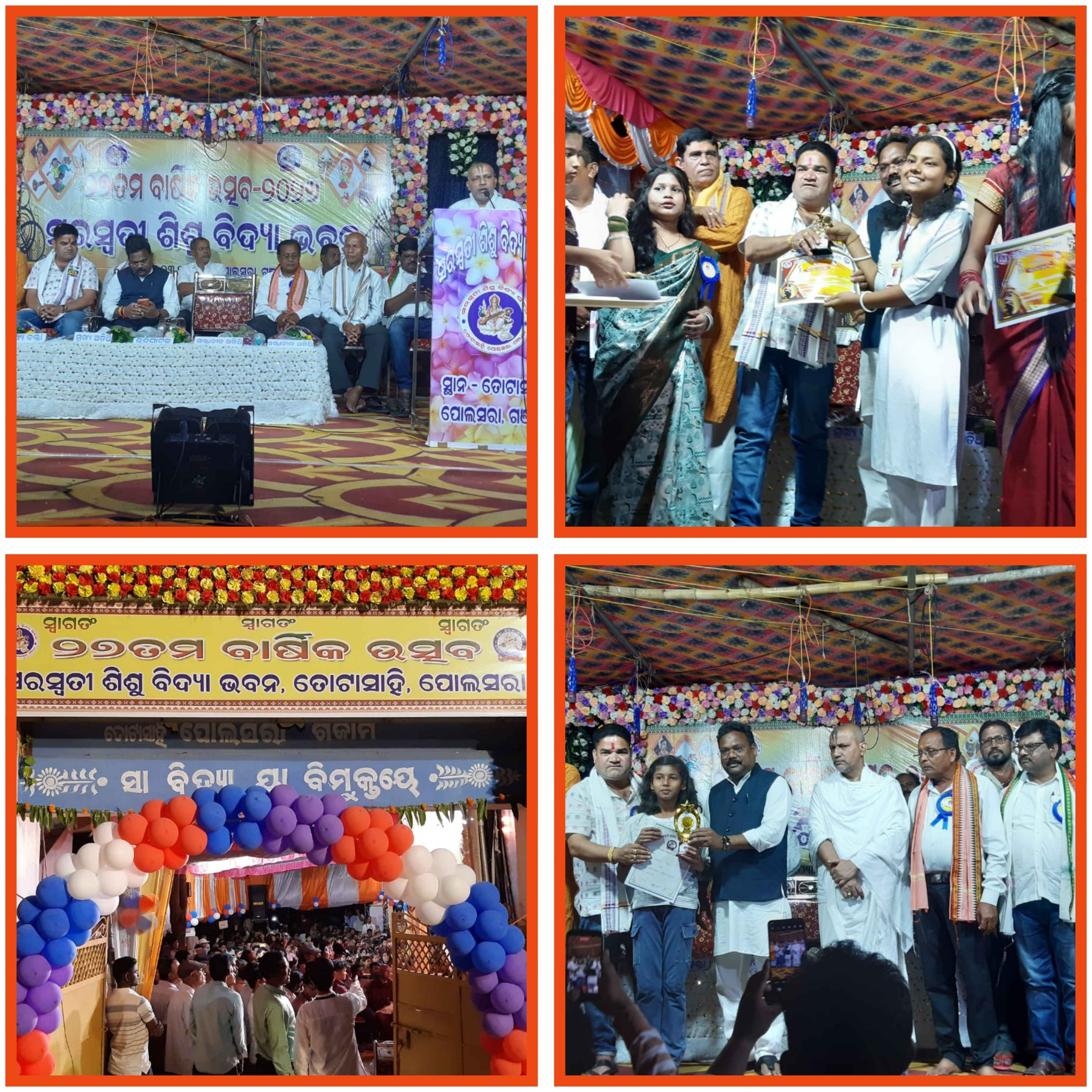 ପୋଲସରା କଲେଜ ତୋଟା ସାହି ସ୍ଥିତ ସରସ୍ଵତୀ ଶିଶୁ ବିଦ୍ୟା ଭବନ ର ୨୭ତମ ବାର୍ଷିକ ଉତ୍ସବ ଅନୁଷ୍ଠିତ ହୋଇଯାଇଛି । ଏଥିରେ ଉଦ୍ଘାଟକ ଭାବେ ମହାମଣ୍ଡଳେଶ୍ୱର ଶ୍ରୀ ମହନ୍ତ କମଳାକାନ୍ତ ଦାଶ ମହାରାଜ ଯୋଗଦେଇ କାର୍ଯ୍ୟକ୍ରମକୁ ଉଦ୍ଘାଟନ କରିଥିବା ବେଳେ ମୁଖ୍ୟ ଅତିଥି ଭାବେ ରାଜ୍ୟ ମତ୍ସ୍ୟ ଓ ପ୍ରାଣୀ ସମ୍ପଦ ବିକାଶ ବିଭାଗ ମନ୍ତ୍ରୀ ଗୋକୁଳାନନ୍ଦ ମଲ୍ଲିକ, ମୁଖ୍ୟ ବକ୍ତାଭାବେ ଭାରତୀୟ ଶିକ୍ଷା ବିକାଶ ସଂସ୍ଥାନର ସହ-ସମ୍ପାଦକ ରଞ୍ଜନ କୁମାର ସାହୁ ଏବଂ ସମ୍ମାନିତ ଅତିଥି ଭାବେ ବିଶିଷ୍ଟ ସମାଜସେବୀ ପ୍ରଭାକର ପଣ୍ଡା ଓ ସମ୍ପାଦକ, ଭାରତୀୟ ଶିକ୍ଷା ବିକାଶ ସଂସ୍ଥାନର ପ୍ରକାଶ ଚନ୍ଦ୍ର ବିଷୋୟୀ ପ୍ରମୁଖ ଯୋଗଦେଇ ଛାତ୍ରଛାତ୍ରୀମାନଙ୍କୁ ଧୈର୍ଯ୍ୟର ସହିତ କଠିନ ପରିଶ୍ରମ ମାଧ୍ୟମରେ ଉଚିତ ଜ୍ଞାନ ଆହରଣ କରି ସମାଜରେ ଜଣେ ଜଣେ ଭଲ ଚରିତ୍ରବାନ ମଣିଷ ହେବାକୁ ପରାମର୍ଶ ଦେବା ସହ ଏଥିପାଇଁ ଆବଶ୍ୟକ ସମୟ ବାହାର କରି ସହଯୋଗ କରିବାକୁ ଉପସ୍ଥିତ ଅଭିଭାବକମାନଙ୍କୁ ନିବେଦନ କରିଥିଲେ।ଅନ୍ୟତମ ଅତିଥି ଭାବେ ଅନୁଷ୍ଠାନର ଉପ-ସଭାପତି କୈଳାସ ଚନ୍ଦ୍ର ଦାସ, ସହ-ସମ୍ପାଦକ ତଥା କାଉନସିଲର ଯଜ୍ଞ ନାରାୟଣ ସାହୁ, କୋଷାଧ୍ୟକ୍ଷ ପଞ୍ଚ ପ୍ରଧାନଙ୍କ ସମେତ ହର ପ୍ରସାଦ ବେହେରା, କୃଷ ଚନ୍ଦ୍ର ଜେନା, ରାମଚନ୍ଦ୍ର ପ୍ରଧାନ, ପ୍ରଫୁଲ୍ଲ କୁମାର ସାହୁ ପ୍ରମୁଖ ସଭ୍ୟବୃନ୍ଦ ଉପସ୍ଥିତ ଥିଲେ । ସମ୍ପୂର୍ଣ୍ଣ କାର୍ଯ୍ୟକ୍ରମକୁ ସମ୍ପାଦକ ତଥା ଆଇନଜୀବୀ ଅଗସ୍ତି ବରାଡ ପରିଚାଳନା କରିବା ସହ ଶେଷରେ ସମସ୍ତଙ୍କୁ ଧନ୍ୟବାଦ ଅର୍ପଣ କରିଥିବା ବେଳେ ଅତିଥି ସ୍ଵାଗତ ଏବଂ ପରିଚୟ ପ୍ରଦାନ ପ୍ରଧାନ ଆଚାର୍ଯ୍ୟ ହରପ୍ରସାଦ ଆଚାର୍ଯ୍ୟ କରିଥିଲେ ।ଏହି ଅବସରରେ ଅରୁଣରୁ ୧୦ମ ଶ୍ରେଣୀ ପର୍ଯ୍ୟନ୍ତ କୃତିତ୍ଵ ଛାତ୍ରଛାତ୍ରୀମାନଙ୍କୁ ଅନୁଷ୍ଠାନ ତରଫରୁ ଅତିଥିବୃନ୍ଦଙ୍କ ଦ୍ଵାରା ପୁରସ୍କାର ସହିତ ପ୍ରଶଂସା ପତ୍ର ପ୍ରଦାନ କରାଯାଇଥିଲା । ଶେଷାର୍ଦ୍ଧରେ ଅନୁଷ୍ଠାନର ଶିଶୁ କଳାକାରଙ୍କ ଦ୍ଵାରା ନୃତ୍ୟ ପରିବେଷଣ ଏବଂ ଫକୀରମୋହନ ସେନାପତିଙ୍କ ରଚିତ "ହସରେ ଆରମ୍ଭ ଲୁହରେ ଶେଷ" (ଏକାଙ୍କିକା) ନାଟକ ଅତି ସୁନ୍ଦର ଭାବେ ପରିବେଷଣ ହୋଇଥିଲା ।