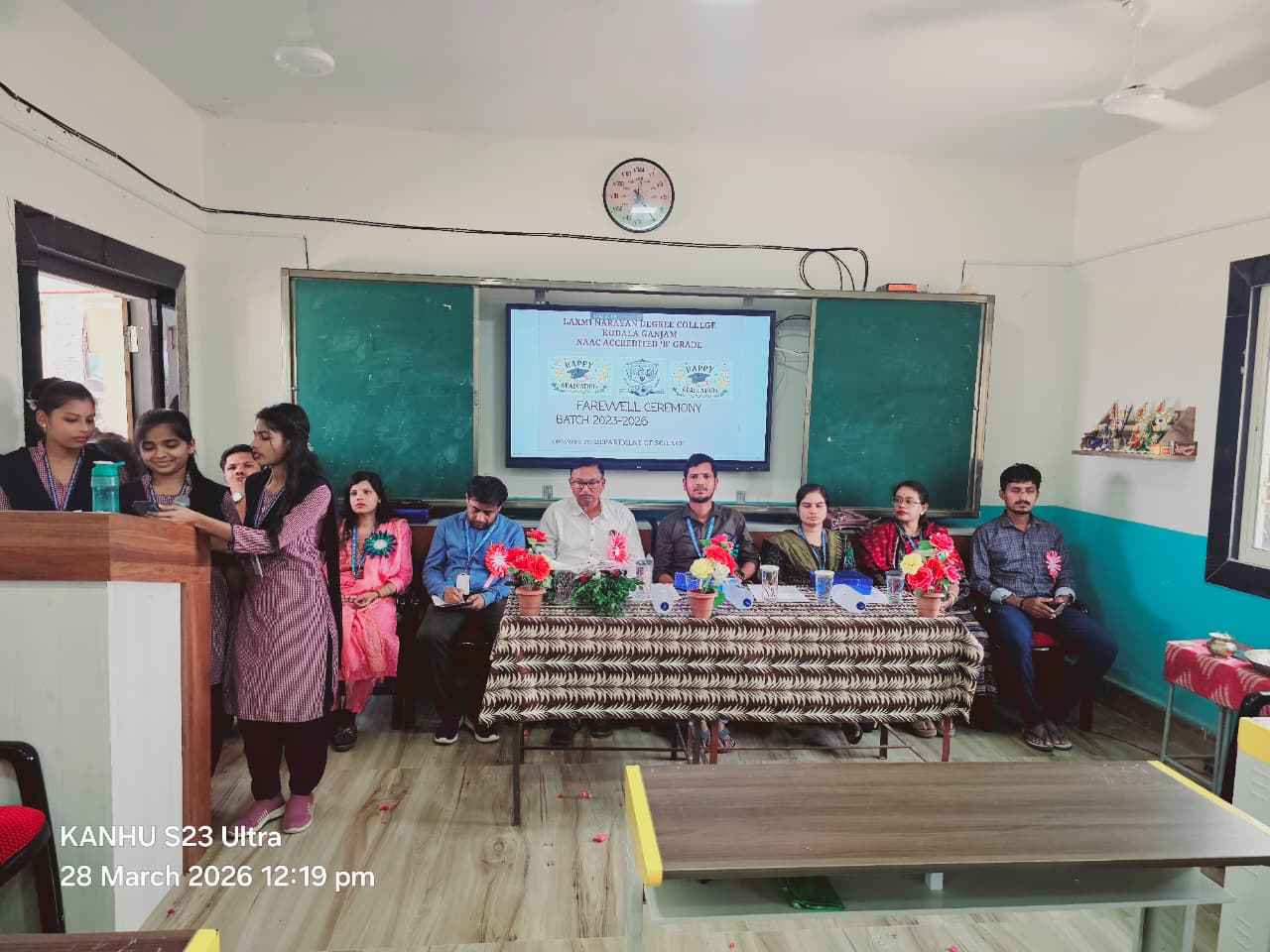 ଲକ୍ଷ୍ମୀନାରାୟଣ ସ୍ନାତକ ମହାବିଦ୍ୟାଳୟ ପରିସରରେ ବିଜ୍ଞାନ ବିଭାଗ ତରଫରୁ ଯୁକ୍ତ ତିନି ତୃତୀୟ ବର୍ଷ ଛାତ୍ରଛାତ୍ରୀଙ୍କ ନିମନ୍ତେ ବିଦାୟ ସମ୍ବର୍ଦ୍ଧନା ଉତ୍ସବ ପାଳନ କରାଯାଇଅଛି। ଏଥିରେ ମହାବିଦ୍ୟାଳୟର ଅଧ୍ୟକ୍ଷ ଶ୍ରୀଯୁକ୍ତ ରଘୁନାଥ ମୁଦୁଲି ଅଧ୍ୟକ୍ଷତା କରି ଛାତ୍ରଛାତ୍ରୀଙ୍କ ନିମନ୍ତେ ଉଦବୋଧନ ଦେଇ ସେମାନଙ୍କ ଭବିଷ୍ୟତ ଉଜ୍ଜଳ କାମନା କରିଥିଲେ । ଅନ୍ତର୍ନିହିତ ଗୁଣାବଳୀ ବର୍ଧକ ସଂଯୋଜକ ଶ୍ରୀମାନ ସପନ କୁମାର ଦାଶ ନିଜ ନିଜର ଲକ୍ଷ୍ୟ ହାସଲ କରିବା ଦିଗରେ ବ୍ରତୀ ହେବା ନିମନ୍ତେ ଉପସ୍ଥିତ ଛାତ୍ର ଓ ଛାତ୍ରୀ ଙ୍କୁ କହିଥିଲେ l କାର୍ଯ୍ୟକ୍ରମ ର ଆବାହକ ଗଣିତ ବିଭାଗର ବିଭାଗୀୟ ମୁଖ୍ୟ ସୁଶ୍ରୀ ପ୍ରିୟଦର୍ଶିନୀ ସାହୁ ବିଭିନ୍ନ ଉପାଦେୟ ବାର୍ତ୍ତା ଦେଇଥିଲେ l ଆଜିର କାର୍ଯ୍ୟକ୍ରମ ରେ ପ୍ରାଣୀ ବିଜ୍ଞାନ ର ବିଭାଗୀୟ ମୁଖ୍ୟ ଶ୍ରୀମତୀ ଅପରାଜିତା ପାତ୍ର, ଉଦ୍ଭିଦ ବିଜ୍ଞାନ ର ବିଭାଗୀୟ ମୁଖ୍ୟ ବର୍ଷାରାଣୀ ମହାନ୍ତି, ପଦାର୍ଥ ବିଜ୍ଞାନର ବିଭାଗୀୟ ମୁଖ୍ୟ ଶ୍ରୀ ରତ୍ନାକର ପ୍ରଧାନ, ରସାୟନ ବିଜ୍ଞାନ ବିଭାଗୀୟ ମୁଖ୍ୟ ମନୀଶା ପଟ୍ଟନାୟକ,ଅଧ୍ୟାପକ ଶ୍ରୀ ଭବାନୀଶଙ୍କର ଆଚାର୍ଯ୍ୟ, କେଶବ ଚନ୍ଦ୍ର ପାଳ,କାହ୍ନୁ ଚରଣ ପାଳ ଓ ଅଧ୍ୟାପିକା ସୁଶ୍ରୀ ଭୁବନେଶ୍ୱରୀ ରାୟସାମନ୍ତ ଆଦି ଯୋଗଦେଇ ଛାତ୍ରଛାତ୍ରୀଙ୍କୁ ଉଚ୍ଚତର ଶିକ୍ଷା ନିମନ୍ତେ ପ୍ରେରଣା ଦେବା ସହ ସେମାନଙ୍କ ର ଭବିଷ୍ୟତ ମଙ୍ଗଳ କାମନା କରିଥିଲେ lତୃତୀୟ ବର୍ଷର ଛାତ୍ରଛାତ୍ରୀ ମାନେ ନିଜ ନିଜର ତିନି ବର୍ଷର ଅଭିଜ୍ଞତା ବର୍ଣ୍ଣନା କରିଥିଲେ। ପରିଶେଷରେ ଯୁକ୍ତ ତିନି ଦ୍ୱିତୀୟ ବର୍ଷ ରସାୟନ ବିଜ୍ଞାନ ବିଭାଗ ଛାତ୍ର ଶ୍ରୀ ରୋଶନ କୁମାର ଗୌଡ଼ ଧନ୍ୟବାଦ ଅର୍ପଣ କରିବା ସହ ସଭାସାଙ୍ଗ କରଯାଇଥିଲା।